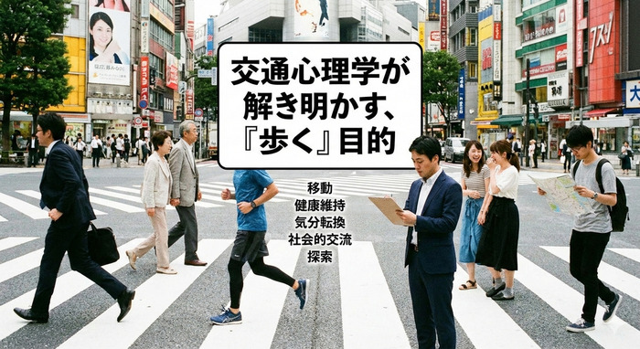 3. **「散歩度」が高い!真の散歩が持つ4つの特徴** さらに本研究では、**「散歩度(散歩らしさの程度)」**という新しい指標を使い、真の散歩とは何かを分析しています。 回答者に「散歩度(0%〜100%)」を記入してもらい分析した結果、散歩度が高い歩行には以下の特徴がありました 。 1. **年長者**であること 2. **同伴者**がいること 3. **目的地がない**こと 4. ルートが**遊歩道、川沿いの道、公園、神社**などを通っていること 5. 経路が**往復型ではない**こと 目的地がなく、自然や景色を楽しめる非往復型のルートを、誰かと共に歩く行為こそが、「散歩らしい散歩」だと裏付けられた形です。 — まとめ:都市計画やあなたの生活にも役立つ「歩行の心理学」 この研究は、私たちが何気なく行っている「歩く」という行為を、目的や心理的側面から細かく分類しました。この分類や影響要因の分析は、**都市計画における遊歩道や散歩空間の整備** 、さらには**健康増進のためのウォーキング施策**など、さまざまな政策や私たちのライフスタイルを見直すための重要なデータとなります 。 普段、車や電車に頼りがちな方も、たまには「散歩」を意識して、自然や街の魅力を発見してみてはいかがでしょうか。