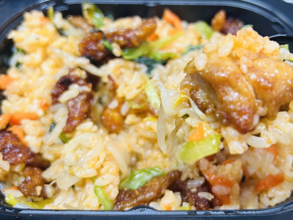 中には、甘辛く味付けされた鶏肉を中心に、
