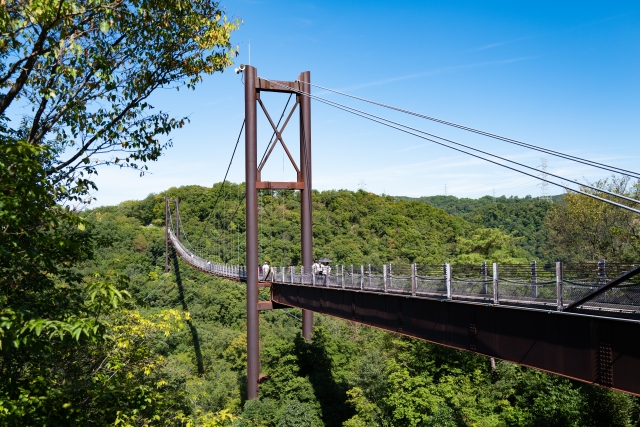 この橋は「ほしだ園地」という自然公園の中にあって、全長は約280メートルほどあるそうです。人が渡れる吊り橋としては最大級みたいで、橋の上からは山の景色が広く見えるそうです。